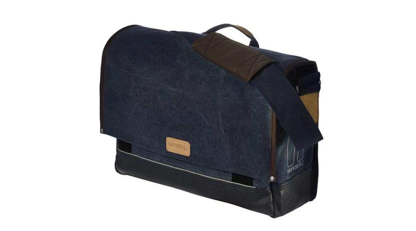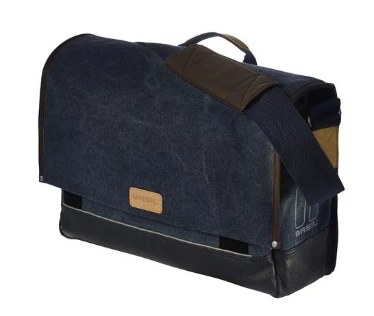 BASIL URBAN FOLD-MESSENGER BAG, Kerékpáros táska, vízálló, újrahasznosított vászonból, vízálló behajtható záródással, bélelt 15"-os laptop rekesszel, belső zsebekkel, első zsebbel, vállpánttal, esővédővel, Hook-On Rögzítő Rendszerrel, fényvisszaverővel, 16 L( becsukva) - 20 L (kihajtva)