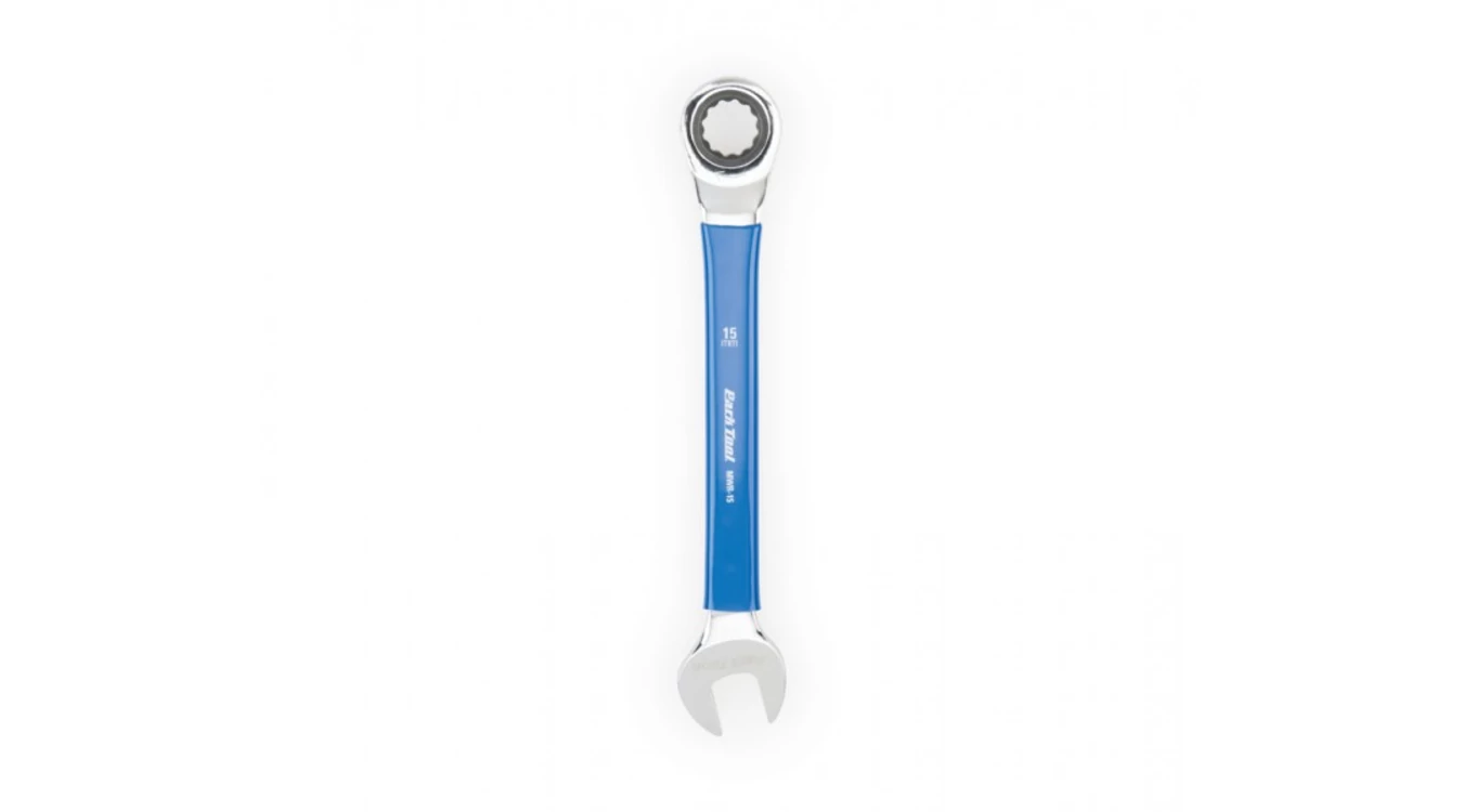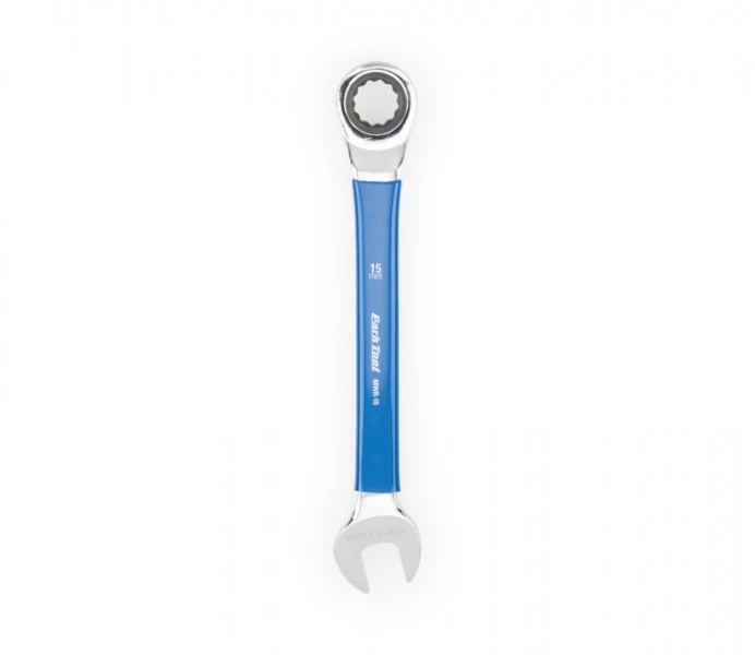 15mm-es nyitott/zárt racsnis (12-körmös), gyönyörűen polírozott, króm vanádium acél villáskulcs, vinyl bevonattal, a világhíres ParkTool minőségben.